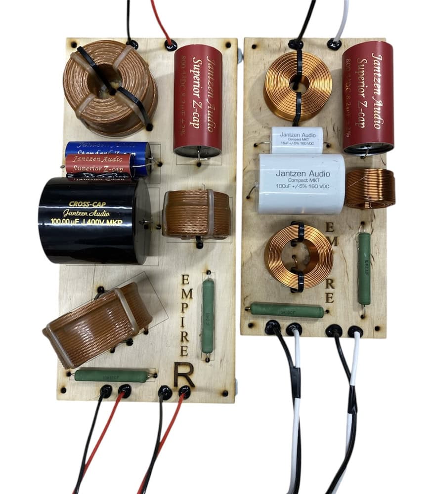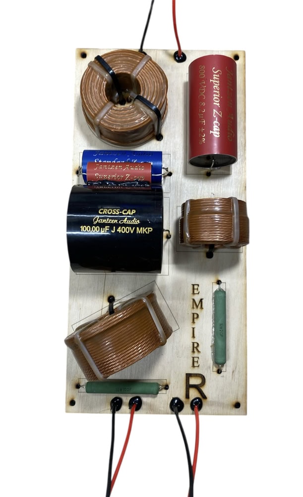 Výhybka je zostavená ručne v point-to-point topológii, aby bola signálová cesta čo najkratšia a bez nežiaducich prechodových prvkov. Použité sú cievky typu Litz Wire zaliate vo vosku pre potlačenie skin-efektu a mikrovibrácií. V signálových vetvách sa nachádzajú fóliové kondenzátory Jantzen Standard Z-Cap a Superior Z-Cap s nízkym ESR a presnou fázovou odozvou. Basová vetva je doplnená o bypass kondenzátor pre rýchlu impulznú reakciu a presný nízkofrekvenčný prenos. Celok má vysokú mechanickú aj tepelnú stabilitu, čo zaručuje konzistentný výkon pri akejkoľvek záťaži.