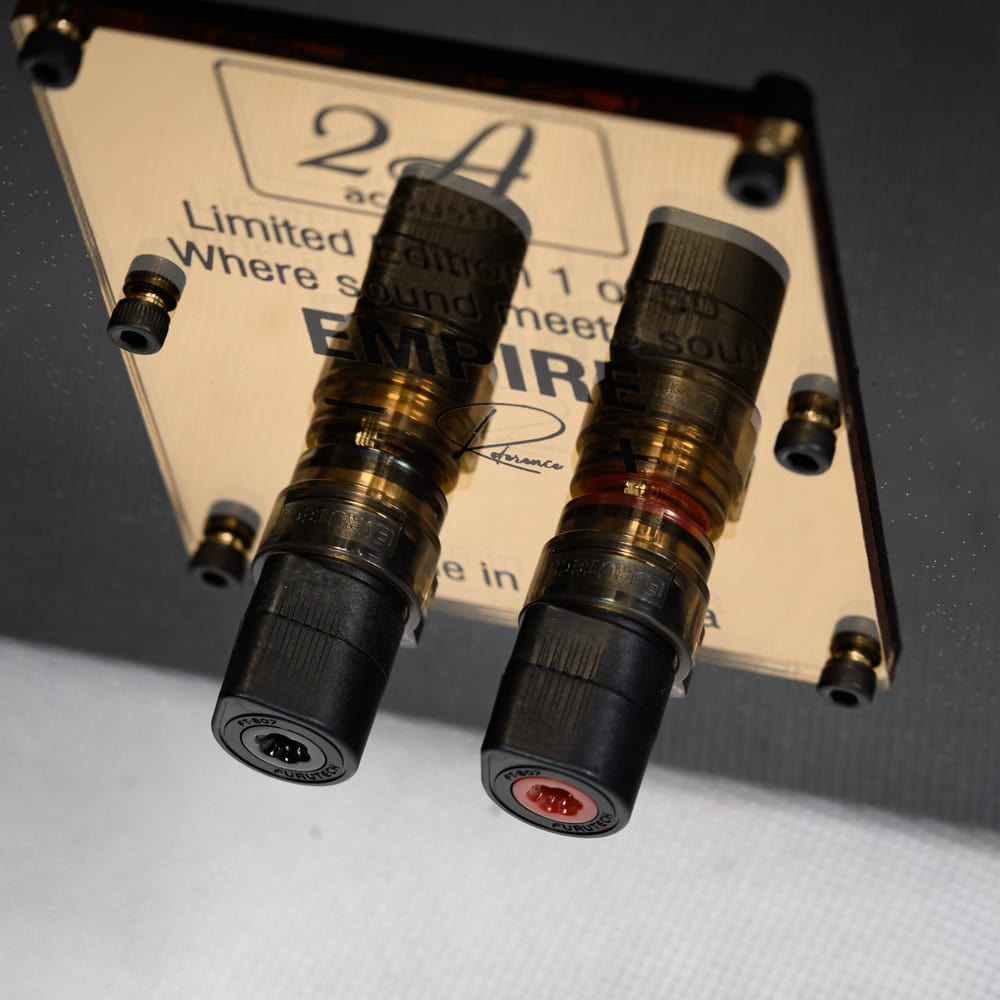 Reproduktorové terminály Furutech sú vyrobené z čistej bezkyslíkatej medi s precíznou povrchovou úpravou. Poskytujú minimálny prechodový odpor, vysokú mechanickú stabilitu a spoľahlivý dlhodobý kontakt. Prenos signálu medzi zosilňovačom a sústavou je v ďaka tomu maximálne čistý a bez strát.