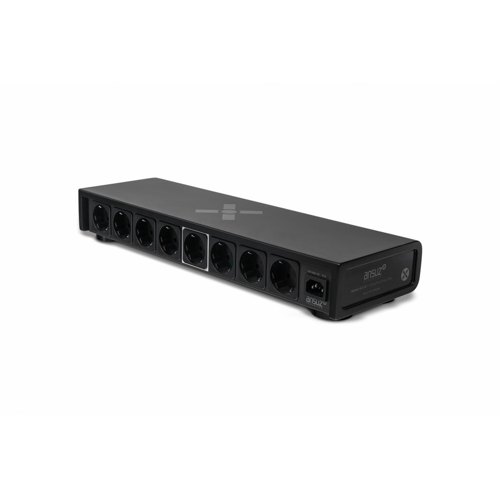 Ansuz Mainz8 X-TC3: Napájací distribútor s 8 zásuvkami, využíva Tesla cievky a dither obvod na redukciu šumu a zlepšenie zvukovej kvality.